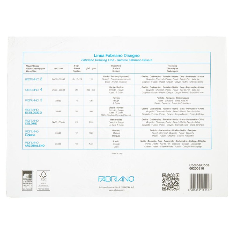 Questo blocco Fabriano per la scuola racchiude fogli realizzati con carta prodotta con il 100% di cellulosa E.C.F. (Elemental Chlorine Free), certificata F.S.C. (©1996 Forest Stewardship Council A.C.) proveniente da foreste gestite secondo rigorosi standard ambientali, sociali ed economici. La superficie ruvida è l'ideale per la grafite morbida, carboncino o pastello. All'interno sono presenti 20 fogli di dimensione 24x33 cm, 110 g/m2.
